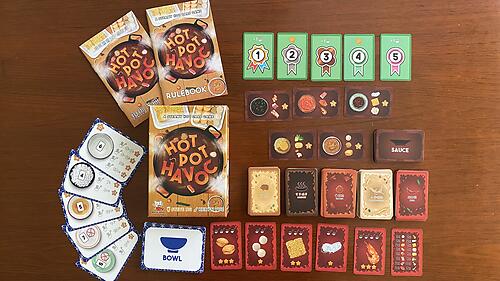 Hotpot Havoc is a 2-5 player game in which first pick the eating utensils of choice, which will give points based on the amount of food you put inside it. Putting too much food will result in demerit points for the round. Meanwhile, you have to quickly flip through your ingredient deck looking for the ingredients you want to keep and throwing out those you do not wish to keep in a public pot. Players can snatch up ingredients in the public pot. Once the players are happy with the ingredients they have, they can grab a turn order tag of their choice which will give them choice to select different type of sauces, which will award bonus points base on the types of ingredients they have in their containers. The player with the most points wins!