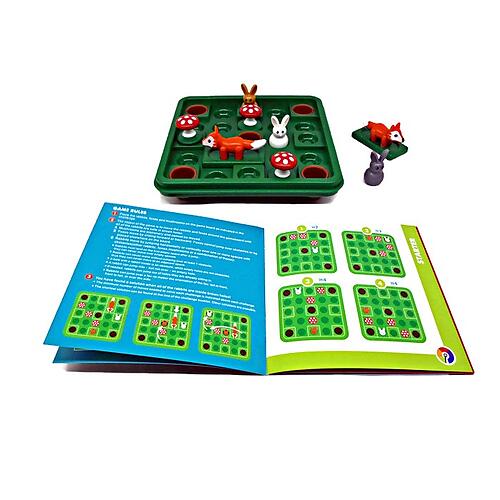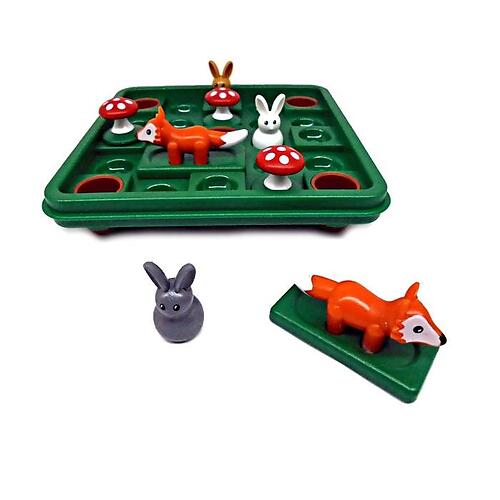 The object of the game is to move the rabbits and foxes around the game board until all the rabbits are safe in brown holes.